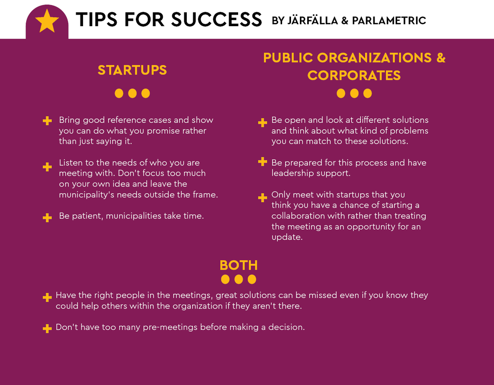 The collaboration was a positive learning curve and particularly opened up Järfälla’s knowledge of startup companies capabilities and the potential digital solutions they can provide for the public sector.  Parlametric were also happy to help the municipality along their road to digitalisation but emphasised the need for continued dialogue.