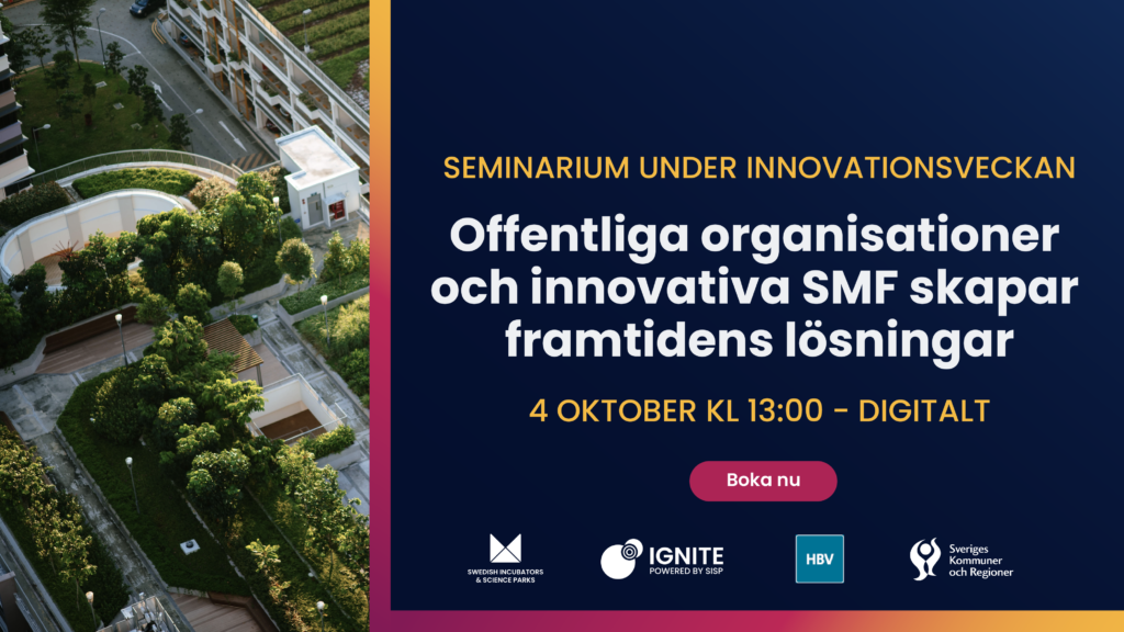 Välkommen till ett inspirerande seminarium med SISP – Swedish Incubators & Science Parks, Ignite, HBV och SKR, Sveriges Kommuner och Regioner den 4 oktober, där vi utforskar den spännande världen av samarbeten mellan offentliga organisationer och innovativa små och medelstora företag (ISMF).