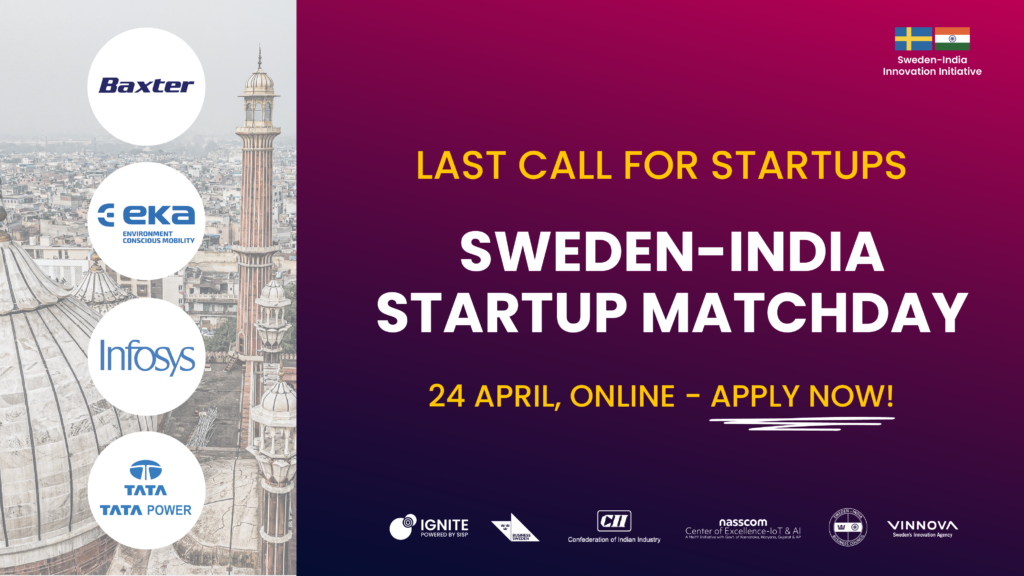 This digital matchmaking is arranged as part of the Sweden India Innovation Initiative in collaboration with Ignite Sweden, NASSCOM Center of Excellence, Business Sweden, the Confederation of Indian Industry (CII), and the Sweden India Business Council (SIBC). It is funded by Vinnova – Sweden’s Innovation Agency.