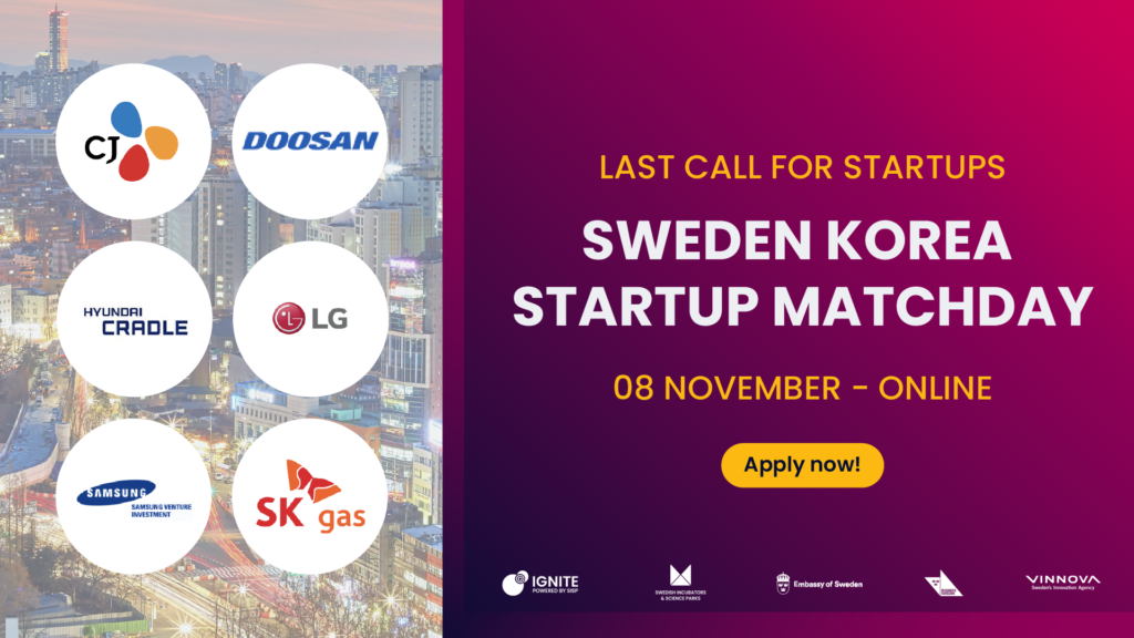 The event is organized by Ignite Sweden, Business Sweden, the Embassy of Sweden in South Korea and funded by Vinnova – Sweden’s Innovation Agency as part of the Sweden-Korea Innovation Initiative.